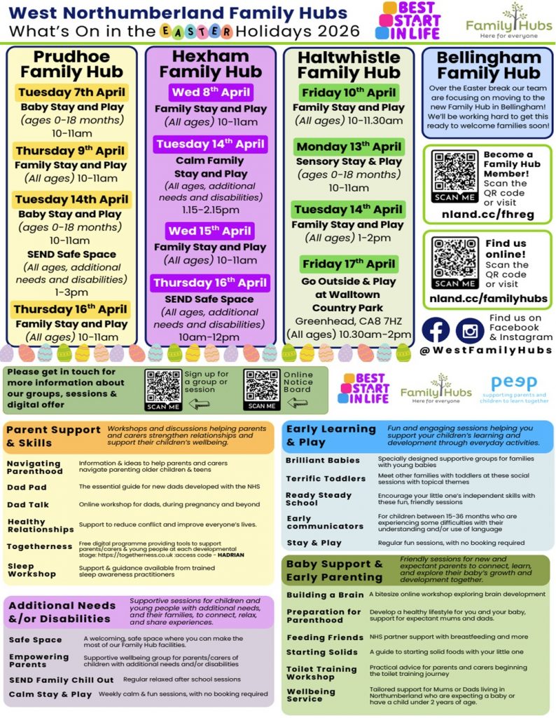 Please see below for information about Easter activities at the Northumberland Family Hubs. It includes a range of sessions and activities for families to enjoy together, a chance for children and grown ups to spend quality time, connect with others, and have fun in a friendly, welcoming space.