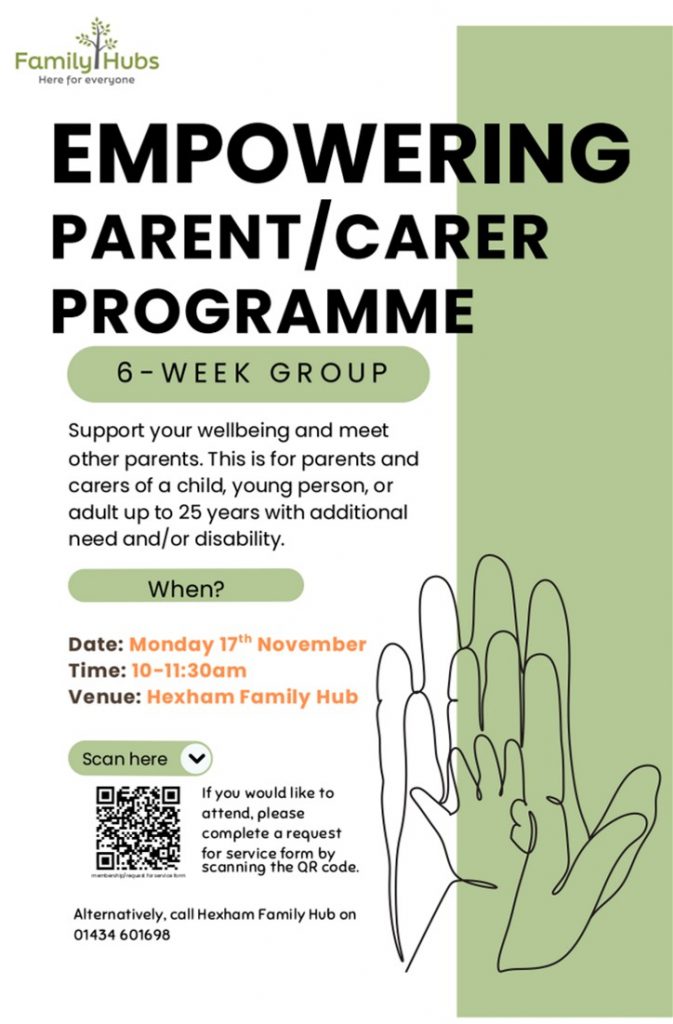 The Family Hub is running a six week programme to support parents and carers of children with SEND called Empowering Parent Carers. The group will cover a variety of topics and is available for anyone as a parent or carer of a child or young person of SEND. There is no criteria needed and no diagnosis needed this is a group to allow parents to come together with out Hub Practitioners to facilitate any support signposting or strategies.